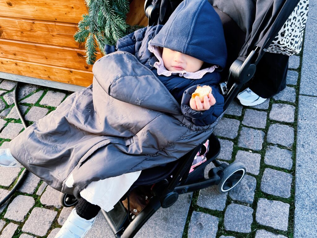 當天是我們待在哥本哈根五天裡最冷的一天,濕氣重、風也大,保暖工作絕對要做好!女兒一開始還很抗拒換厚外套,結果進園後冷到乖乖配合換上!如果是在推車上強烈建議加裝推車睡袋,這次歐洲旅行真的是路上每台推車上都有的裝備,我們這次帶的是兩用蓋毯,背著、坐著都可以使用,且只會包到腳,女兒比較不會抗拒,關鍵字可以搜尋「背帶斗篷、背巾披風」,可以依據氣溫購買,有刷毛、羽絨、棉…等材質。