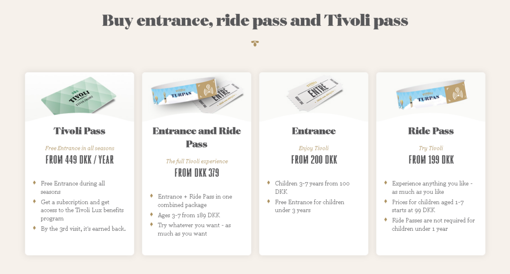 Tivoli 的票價會隨淡旺季浮動,官網購票要留意,3 歲以下「入場」是免費的! 1歲以下「遊樂設施」是免費的!擔心買錯現場也可以購票,當天晚上4點左右抵達不需要排隊就買到票囉~票價會浮動,建議出發前先Tivoli Gardens官網確認票價。